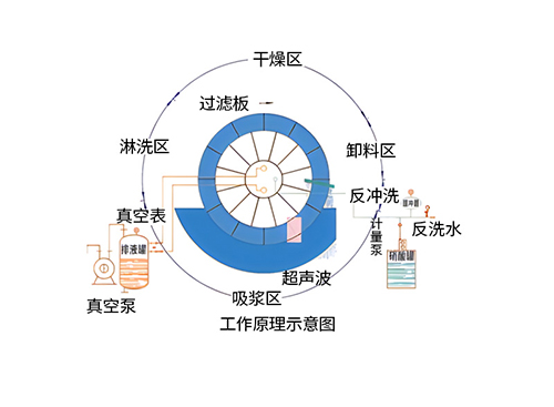 干燥区:滤饼继续在高真空力的作用下脱水。卸料区:进入无真空的情况下,刮刀自动卸料。反冲洗:工业水或滤液通过分配阀进入陶瓷板由内向外清洗堵塞的微孔。在陶瓷板使用一个周期后,采用超声波配合低浓度酸混合清洗,保持陶瓷板的高效使用。