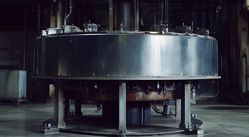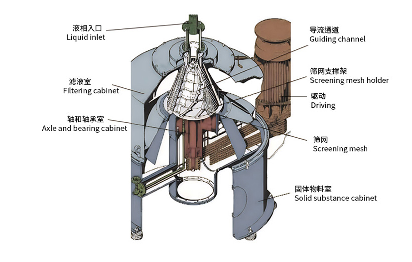 物料由顶部进入离心机内的导流通道,在离心力的作用下,物料沿导流通道向下流动,在流动过程中,液体通过筛网进入滤液室,固体物料则顺导流通道被排入下部的固体物料室。利用离心力,离心机完成离心过滤和离心卸料。