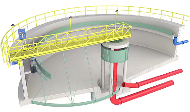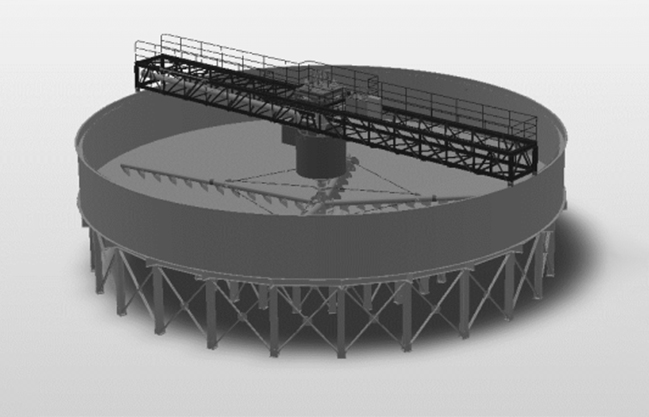 利用物料重力及絮凝沉降实现高效脱水。浓密机上部产生较清净的澄清液,由顶部的环形溜槽溢流排出。 进料管中浆液沿稳流筒内筒水平切线进入并与絮凝剂混合、脱气消能,混合后的料向下沉降,经筒底分料沿抛物线方向布料;沉降下来的物料由耙架刮集到池体中心集中排出。