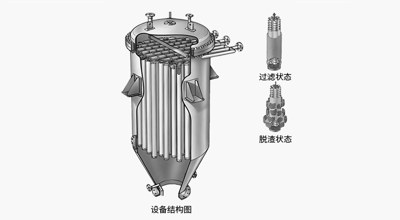 其中罐体装置还包括喷淋装置、反吹反洗装置、缓冲装置、防膨胀装置、滤芯元件装置、滤芯悬挂及配重装置、电伴热装置、搓洗装置组成。